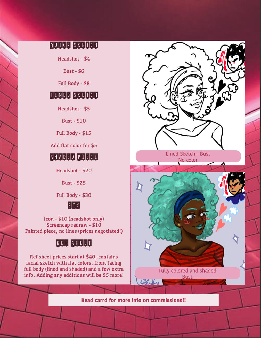 Backgrounds on commissions will include solid color background as well as a png for color pieces. If you would like a more complicated background it will be +$5 because it takes me a bit longer.